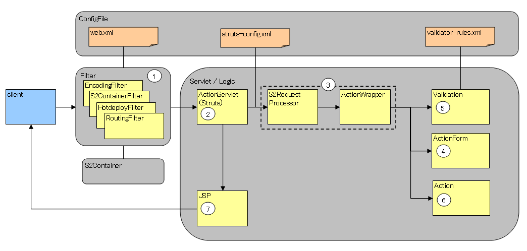 クライアントからリクエストが届き、SAStrutsの各フィルターが動作する。