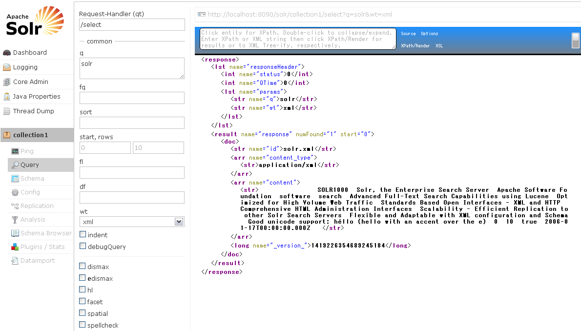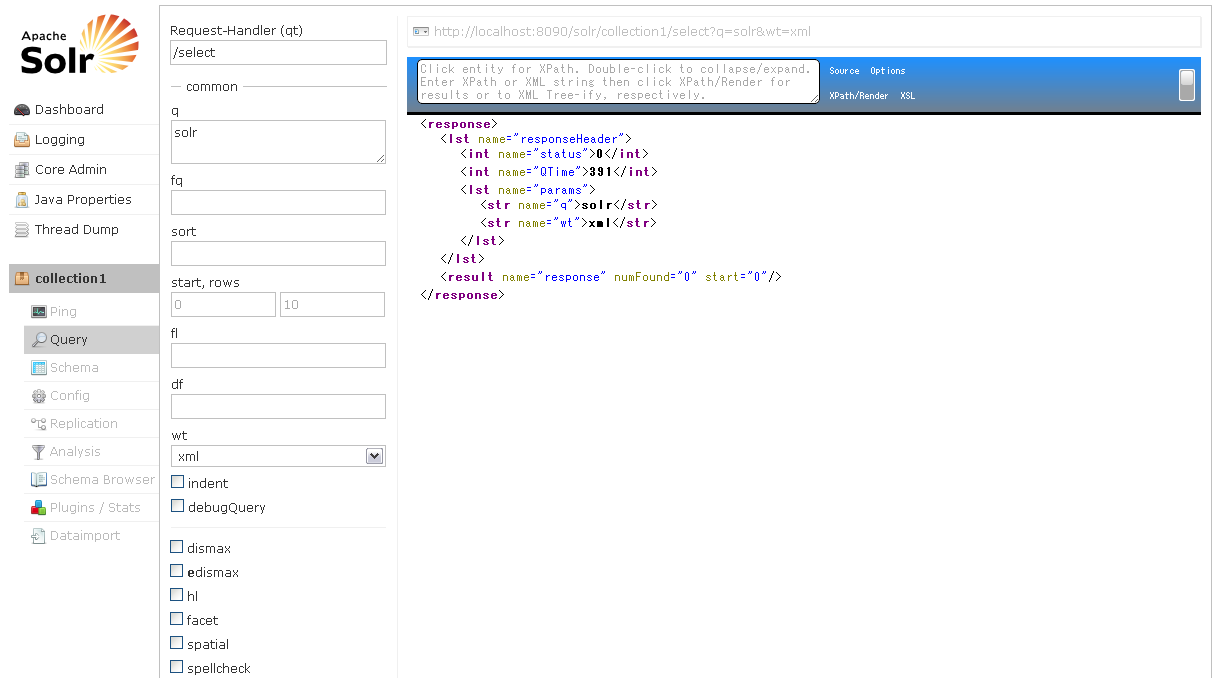 クエリー: http://localhost:8080/solr/collection1/select?q=solr&wt=xml